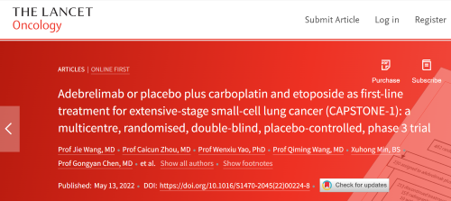 北京时间2022年5月14日,asiagame医药自主研发的PD-L1抑制剂阿得贝利单抗治疗广泛期小细胞肺癌的III期临床研究(CAPSTONE-1研究)成果正式全文在线发表于国际权威学术期刊《柳叶刀·肿瘤学》(《THE LANCET Oncology》,影响因子41.316)。CAPSTONE-1研究结果显示,阿得贝利单抗联合化疗一线治疗广泛期小细胞肺癌相较于安慰剂联合化疗可以显著延长患者总生存期至15.3个月[1],刷新现有免疫药物一线治疗广泛期小细胞肺癌的总生存纪录[2]